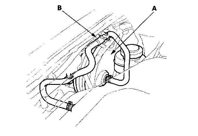 3. Disconnect the brake booster vacuum hose at the booster (A). The check valve (B) is built into the hose.