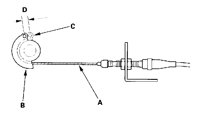 2. Measure the amount of movement of the output linkage (B) until the engine speed starts to increase. At first, the output linkage should be located at the fully closed position (C). The free play (D) should be 3.75 ± 0.5 mm (0.15 ± 0.02 in.).