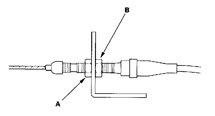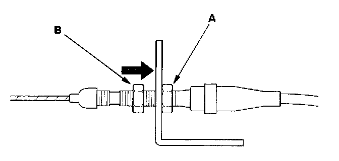 3. If the free play is not within specs, move the cable to the point where the engine speed starts to increase, then tighten the locknut (A) and adjusting nut (B).