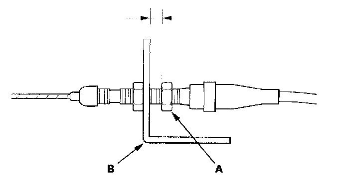 4. Turn the adjusting nut (A) until it is 3.75 ± 0.5 mm (0.15 ± 0.02 in.) away from the bracket (B).