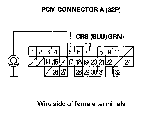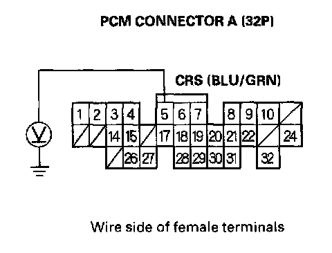 8. Connect a voltmeter between PCM connector A terminal No. 5 and body ground. Test drive the vehicle at speeds over 25 mph (40 km/h) with the cruise control set, and watch the voltmeter.