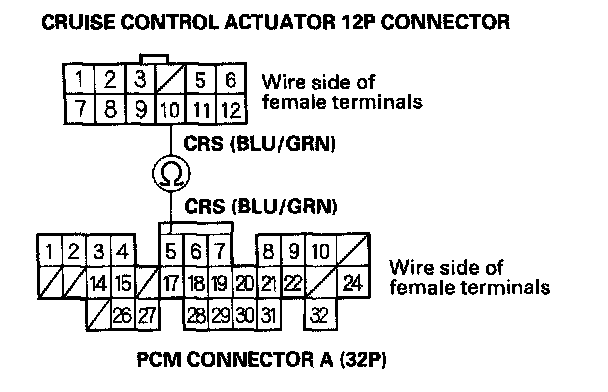 6. Check for continuity between PCM connector A terminal No. 5 and cruise control actuator 12P connector terminal No. 10.