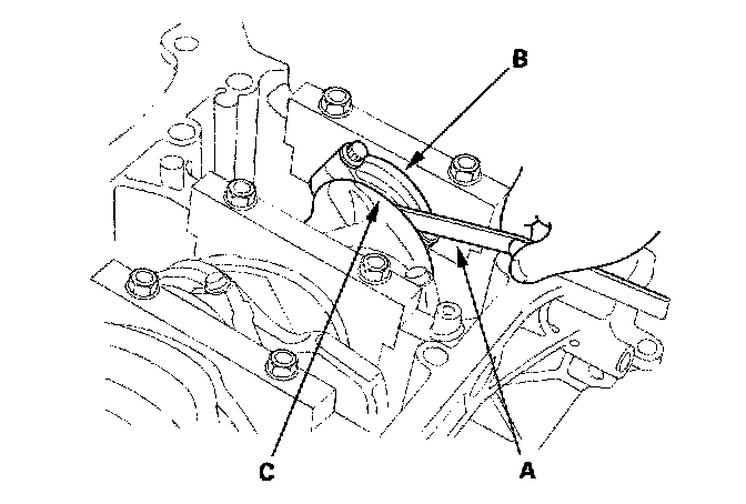 3. Measure the connecting rod end play with a feeler gauge (A) between the connecting rod (B) and crankshaft (C).
