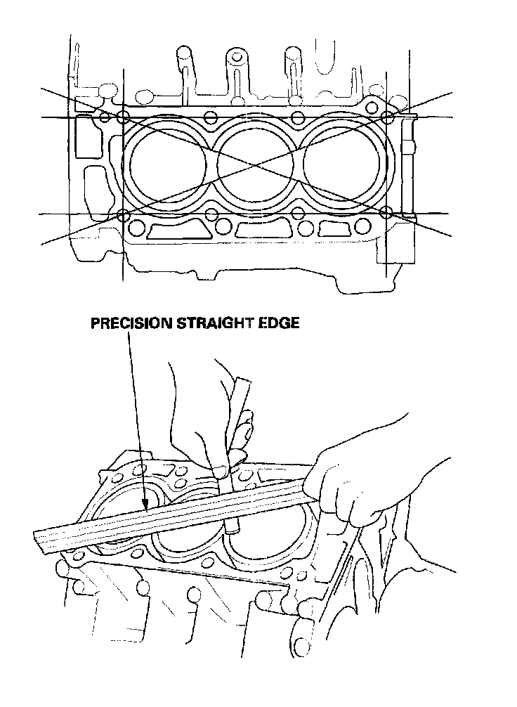 6. Check the top of the cylinder block for warpage. Measure along the edges and across the center as shown.
