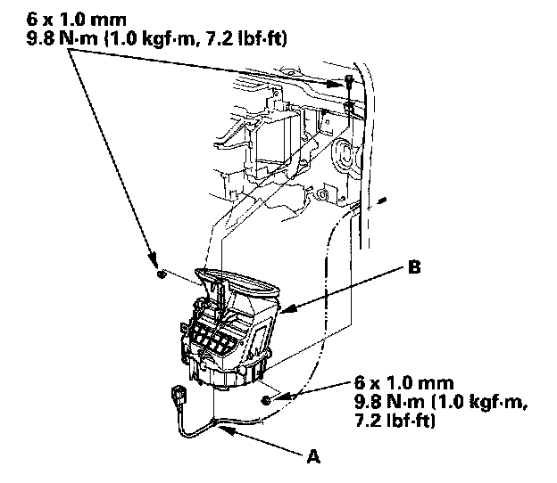 5. Remove the wire harness clip (A). Remove the mounting nuts, the mounting bolt, and the blower unit(B).