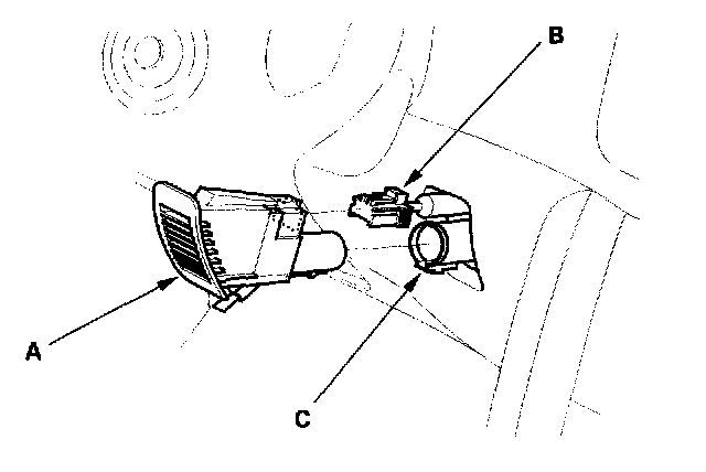 In-car Temperature Sensor Replacement1. Remove the in-car temperature sensor (A) from the dashboard, then disconnect the 2P connector (B) and the air hose (C). Be careful not to damage the sensor or the dashboard.