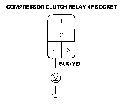 4. Measure the voltage between the No.1 terminal of the compressor clutch relay 4P socket and body ground.