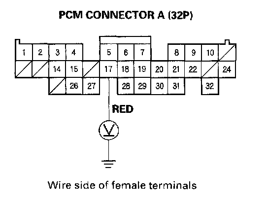 13. Using the backprobe set, measure the voltage between the No. 17 terminal of PCM connector A (32P) and body ground with the PCM connectors connected.