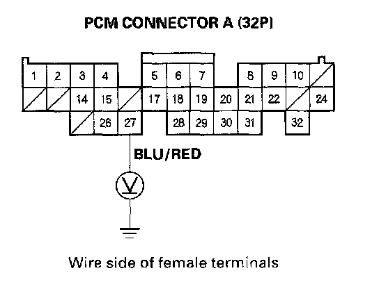 14. Using the backprobe set, measure the voltage between the No. 27 terminal of PCM connector A (32P) and body ground with the PCM connectors connected.
