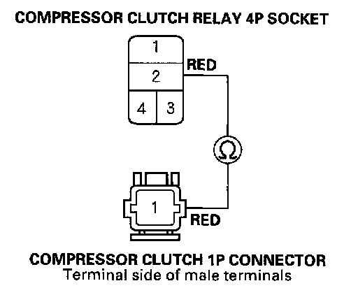 17. Check for continuity between the No. 2 terminal of the compressor clutch relay 4P socket and the No. 1 terminal of the compressor clutch 1P connector