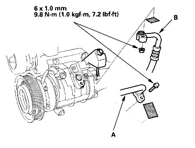 7. Remove the bolt and the nut, then disconnect the suction line (A) and discharge line (B) from the compressor. Plug or cap the lines immediately after disconnecting them to avoid moisture and dust contamination.