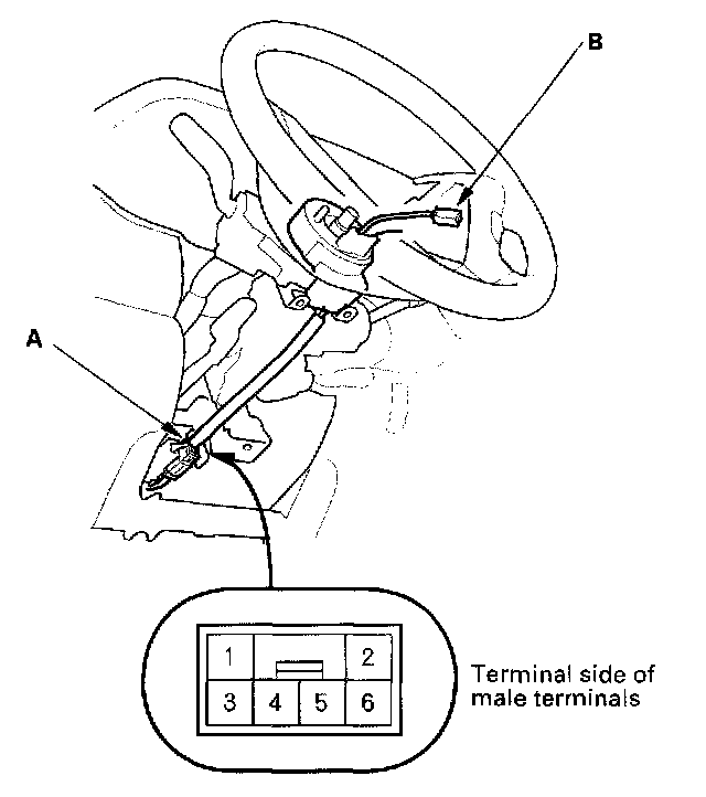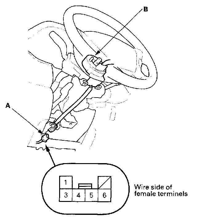 5. Reconnect the dashboard wire harness B 6P connector (A), and disconnect the horn switch positive 1P connector (B).