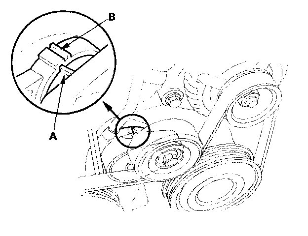 2. Check that the pointer (A) on auto-tensioner housing is not beyond the edge of the indicator rib (B) on the tensioner base If pointer is beyond the indicator rib, replace the alternator-compressor belt.