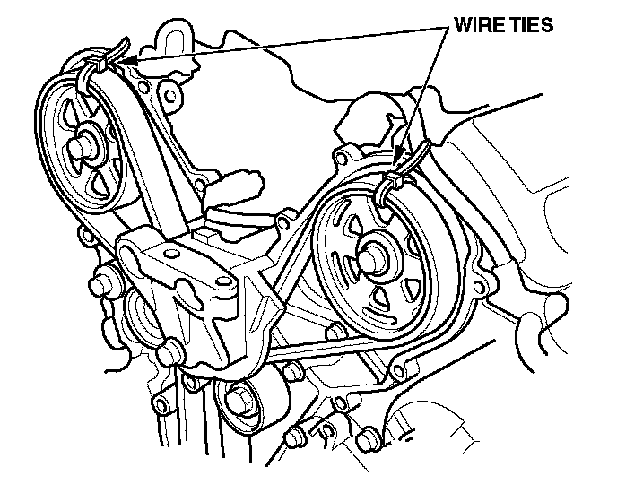 2. Secure the timing belt to both cam pulleys using plastic wire ties. This helps to keep the timing belt in place while you replace the auto-tensioner.