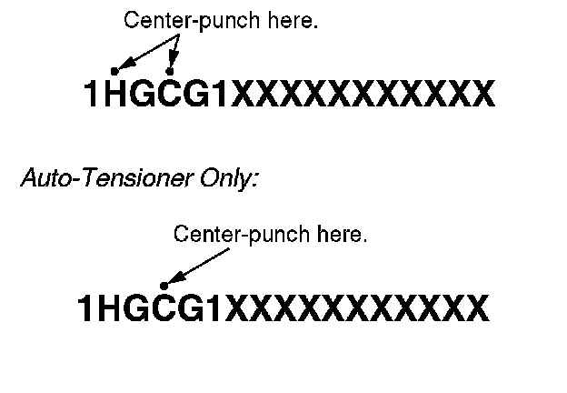 11. If you replaced the water pump, the timing belt, and the auto-tensioner, center-punch completion marks above the second and the fourth characters of the engine compartment VIN. If you replaced only the auto-tensioner, center-punch a completion mark above the fourth character of the engine compartment VIN.