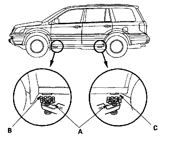 1. Position the hoist lift blocks (A), or safety stands, under the vehicle's front support points (B) and rear support points (C).