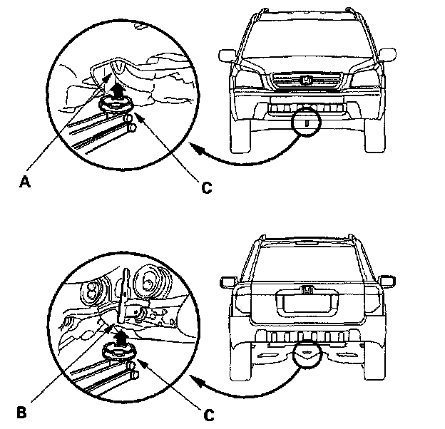 4. Position the floor jack under the front jacking bracket (A) or rear jacking bracket (B), center the jack lift platform (C), on the jacking bracket and jack up the vehicle high enough to fit the safety stands under it.