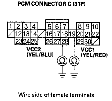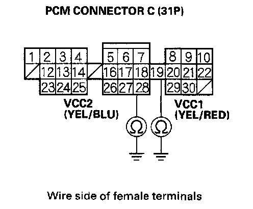 16. Disconnect the 3P connector from each of these sensors, one at a time, and check for continuity between body ground and PCM connector terminal C19 and C28 individually.
