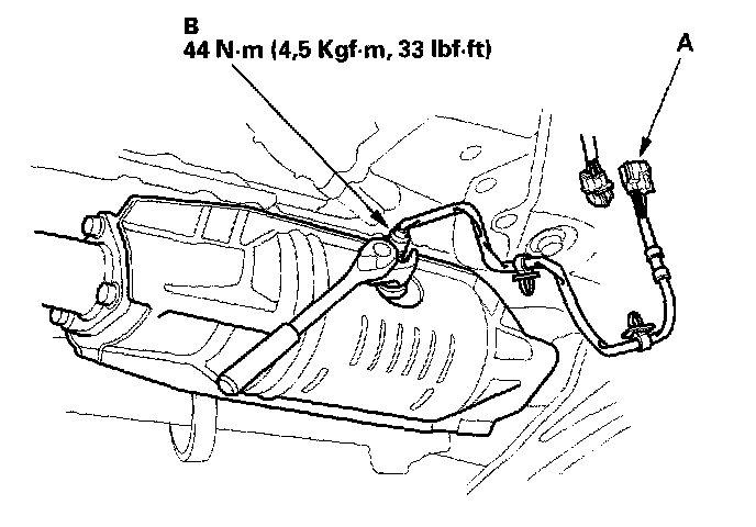 1. Disconnect the secondary HO2S 4P connector (A), then remove the secondary HO2S (B).