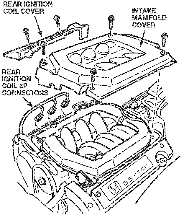 8. Remove the intake manifold cover. Unplug the ignition coil 3P connectors on the rear bank, then remove the rear ignition coil cover.