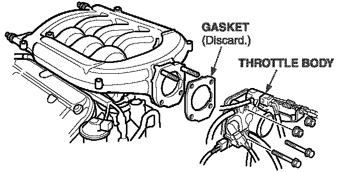 10. Remove the throttle body from the intake manifold (two nuts and two bolts). Leave all hoses, cables, and electrical connectors connected to the throttle body. Discard the throttle body gasket.
