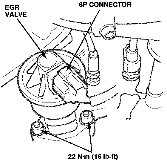 24. Install the new EGR valve with a new gasket. Torque the mounting nuts to 22 Nm (16 lb-ft). Reconnect the 6P connector.