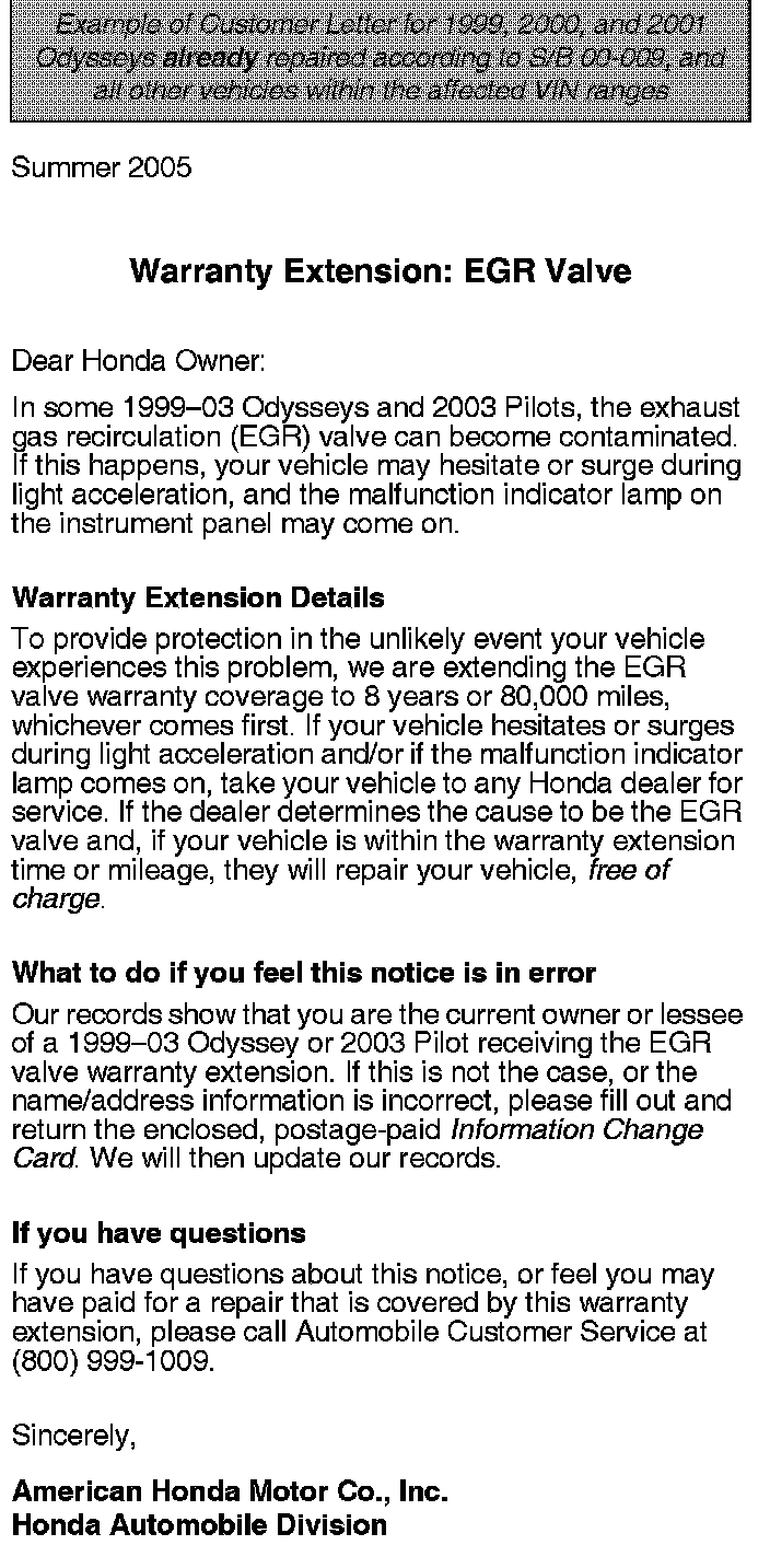 Owner Letter - Warranty Extension: EGR Valve