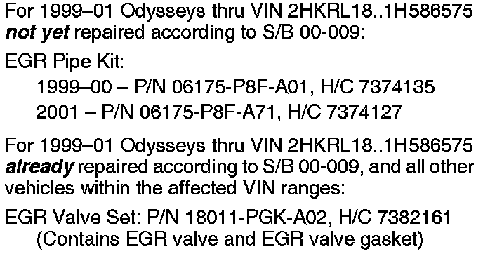 ^ On 2001 Odysseys after VIN 2HKRL18..1H586575, all 2002 Odysseys, 2003 Odysseys within the affected VIN ranges, and 2003 Pilots within the affected VIN range, EGR valve sticking is covered for 8 years or 80,000 miles, whichever occurs first.