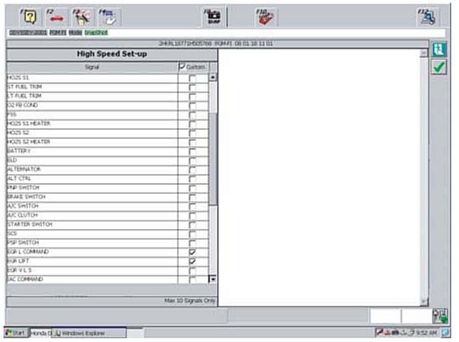 9. From the High Speed menu screen, select these parameters: Engine Speed, VSS, ECT Sensor, Map Sensor, IP Sensor, EGR-L-Command, and EGR LIFT. Then select the green Check button.