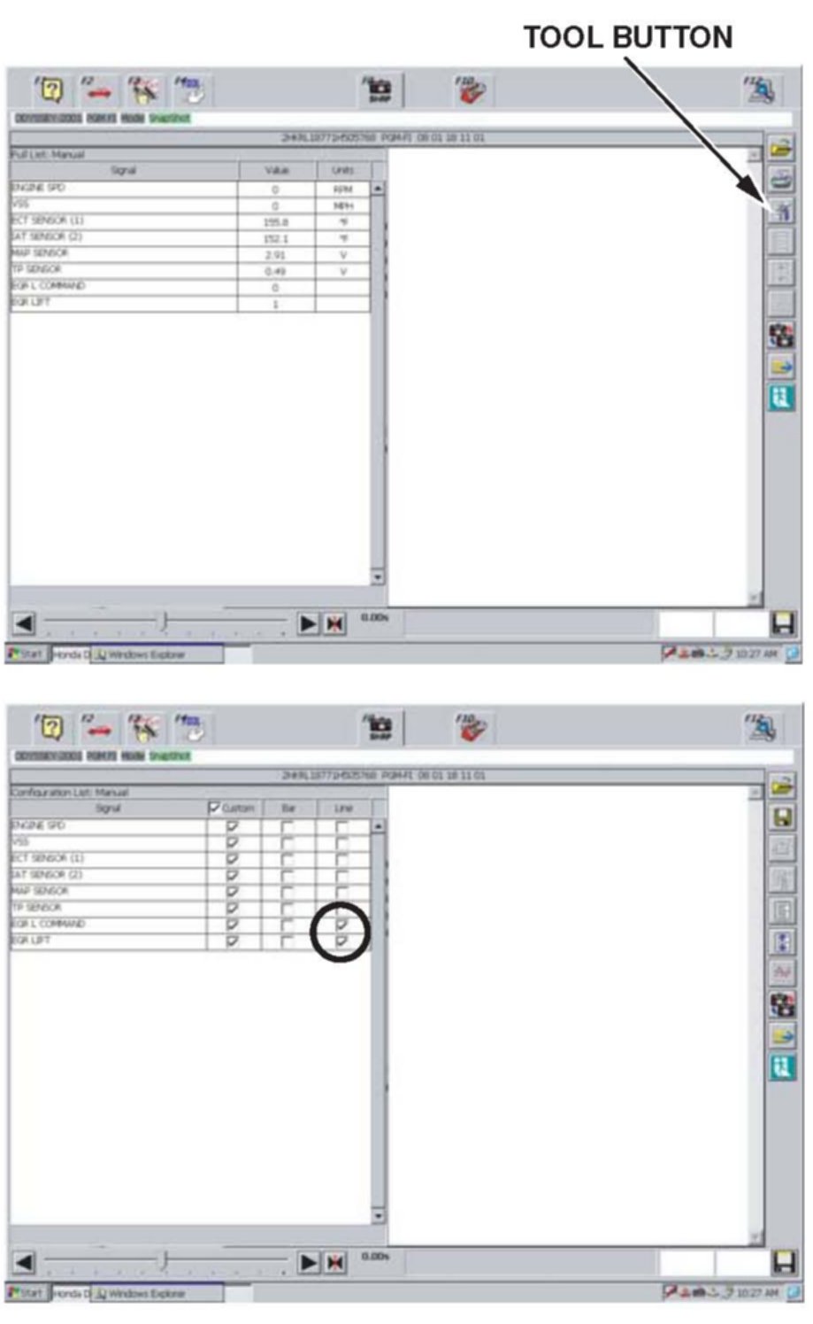 14. Select the Tool button. Under the line graph column, select EGR L COMMAND and EGR LIFT.