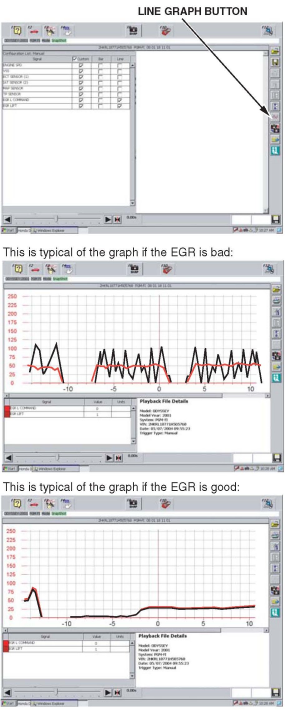 ^ If the EGR LIFT graph is different from the EGR L COMMAND graph, the EGR valve is bad. Go to REPAIR PROCEDURE A: EGR VALVE REPLACEMENT.