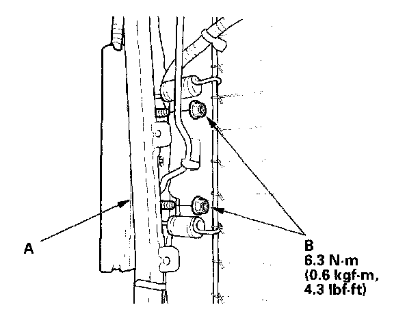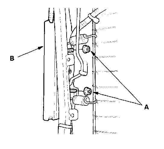 1. Place the new side airbag on the seat-back frame (A). Tighten the side airbag mounting nuts (B).