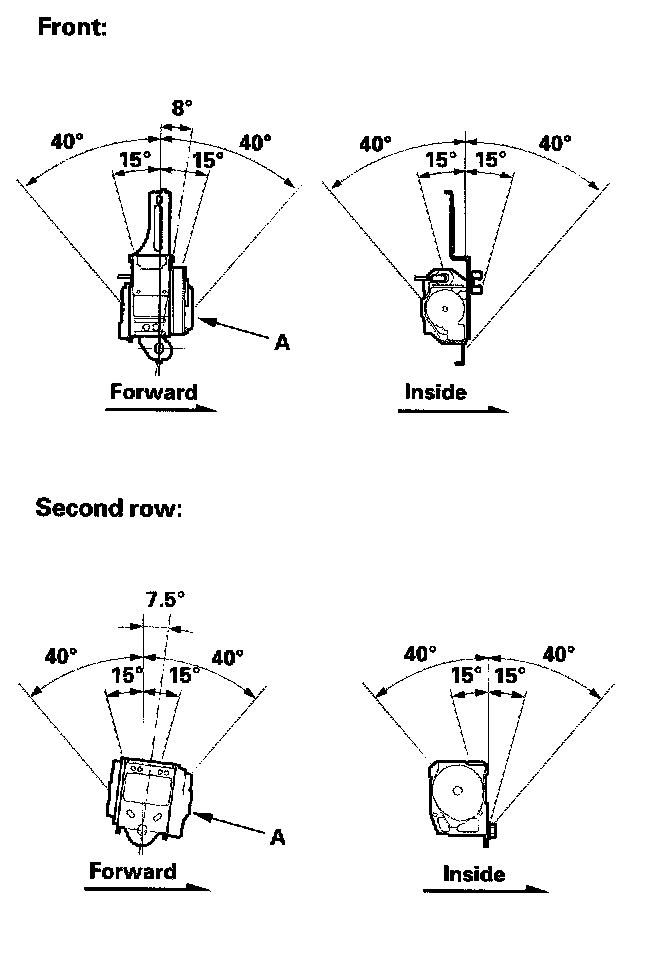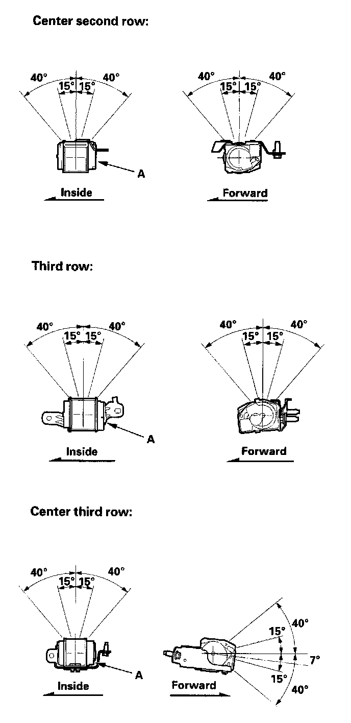 2. Make sure that the seat belt does not lock when the retractor (A) is leaned slowly up to 15 ° from the mounted position. The seat belt should lock when the retractor is leaned over 40 °. Do not attempt to disassemble the retractor.