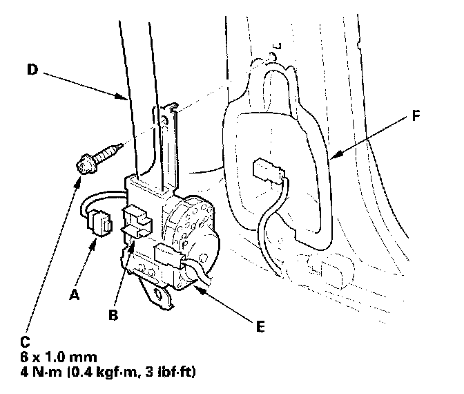 7. Release the seat belt tensioner connector (A) from the connector holder (B), and disconnect it. Remove the retractor mounting ET screw (C), and remove the front seat belt (D) and retractor (E).