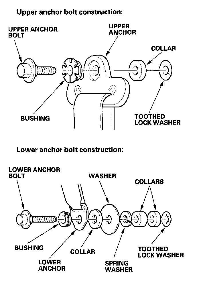 - Assemble the washers, collars, and bushing on the upper and lower anchor bolts as shown.