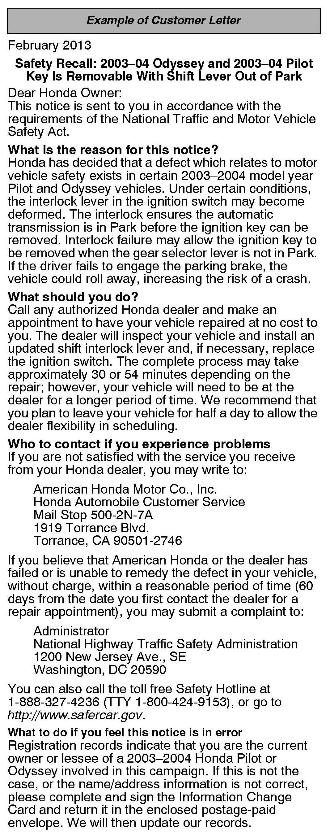 Safety Recall: 2003-04 Odyssey and 2003-04 Pilot Key Is Removable With Shift Lever Out of Park