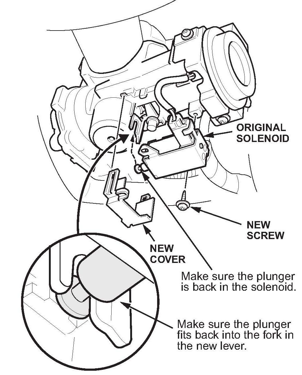 14. Reinstall the solenoid using a new screw. Make sure the solenoid plunger is positioned in the fork on the lever as shown.