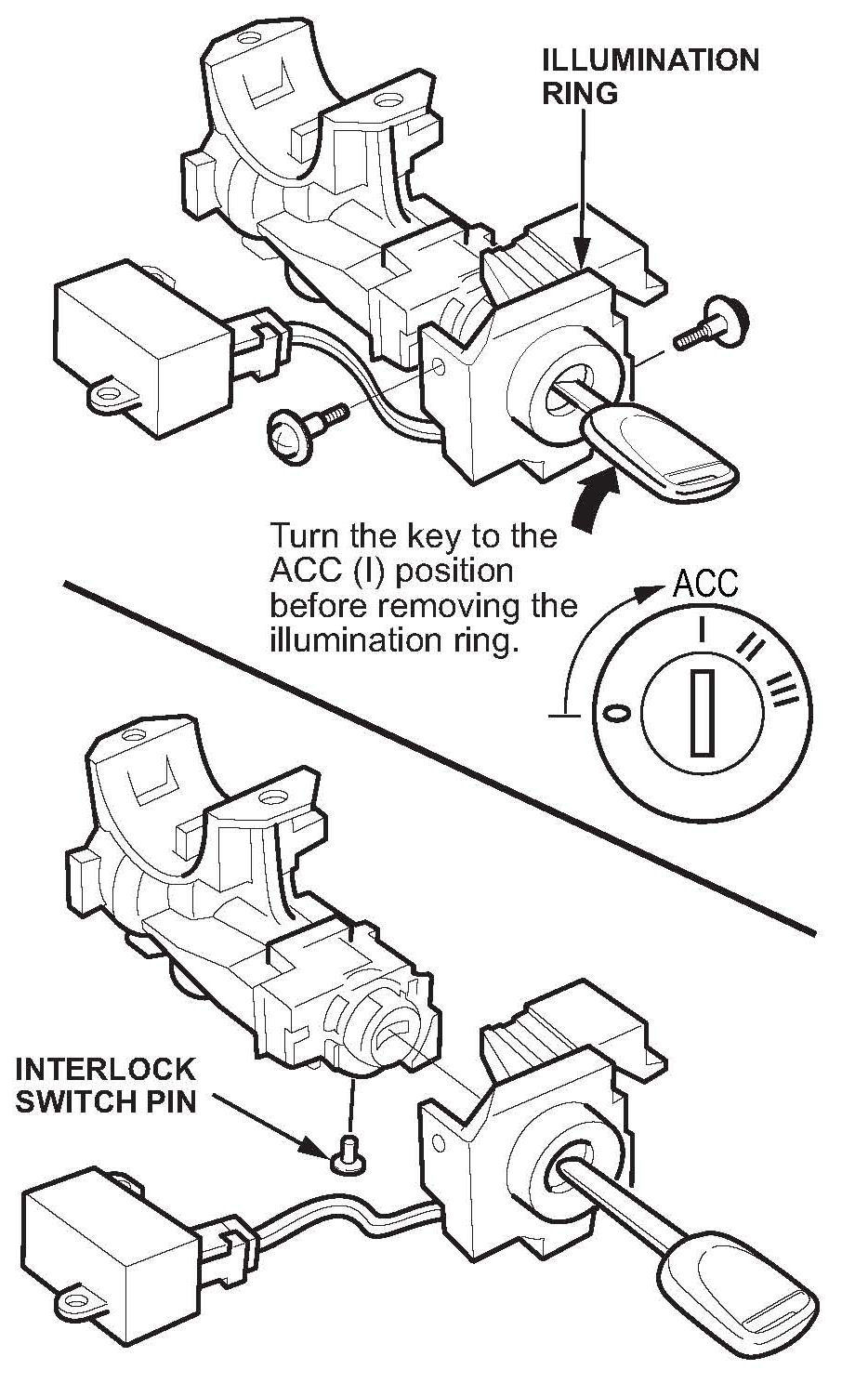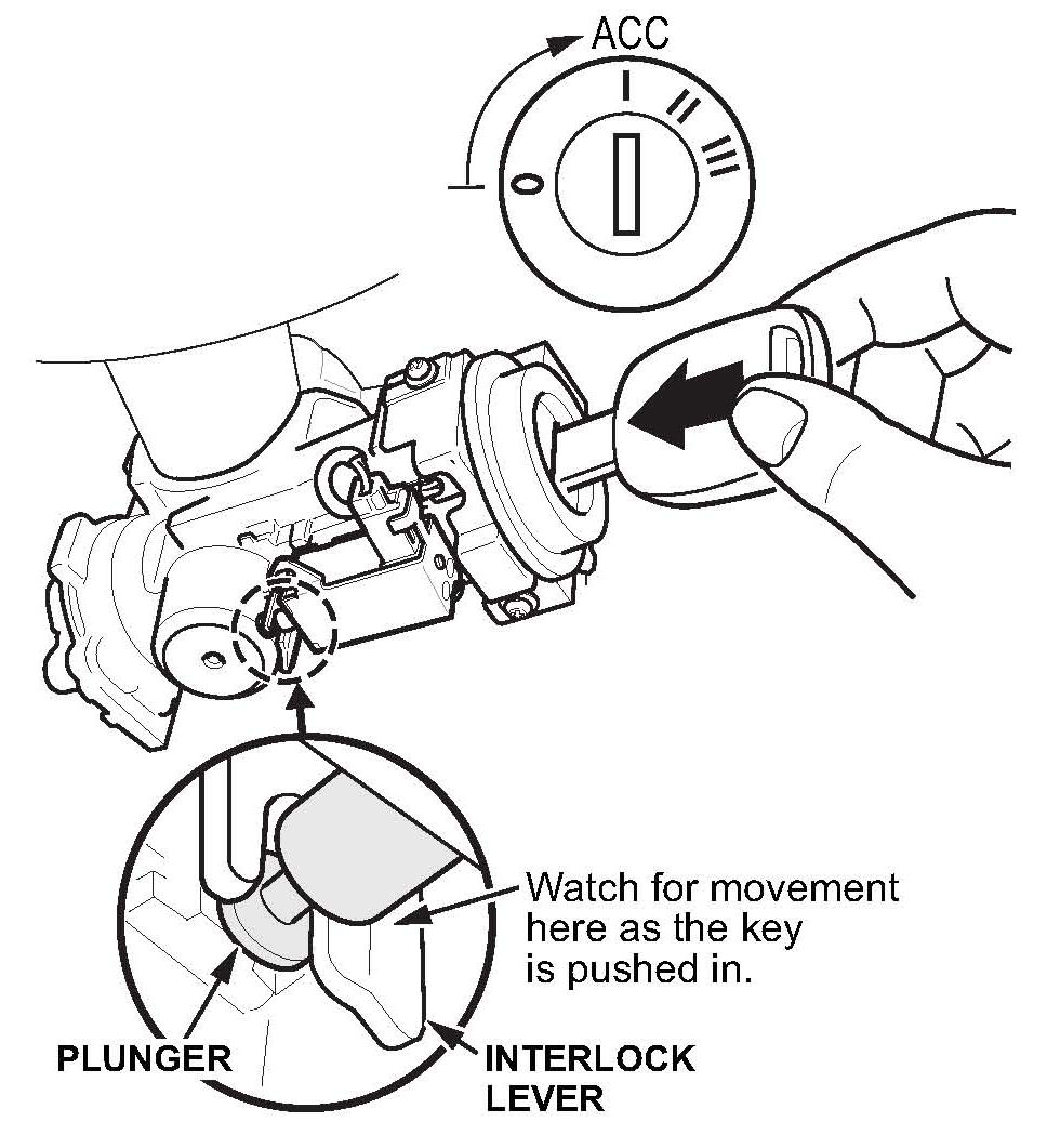 3. Turn the ignition switch to ACC (I), and push the key in while watching the solenoid plunger and the fork on the interlock lever.