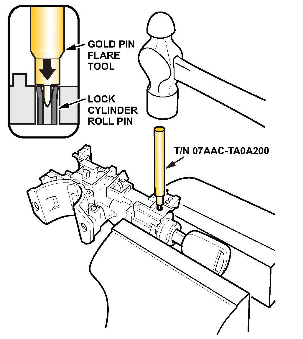 ^ Insert the gold pin flare tool into the lock cylinder roll pin hole, and tap it in with a small hammer until the flare tool is completely inserted.