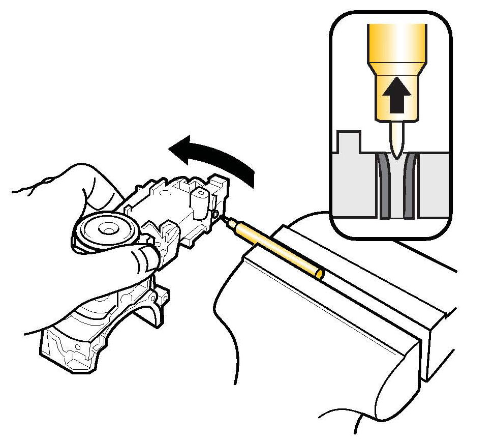 ^ Remove the gold pin flare tool by removing the ignition switch body from the vise, and placing the end of the gold pin flare tool in the vise. Carefully pull and twist the switch body until the tool comes out. The lock cylinder roll pin is now flared, but still remains in the switch body.