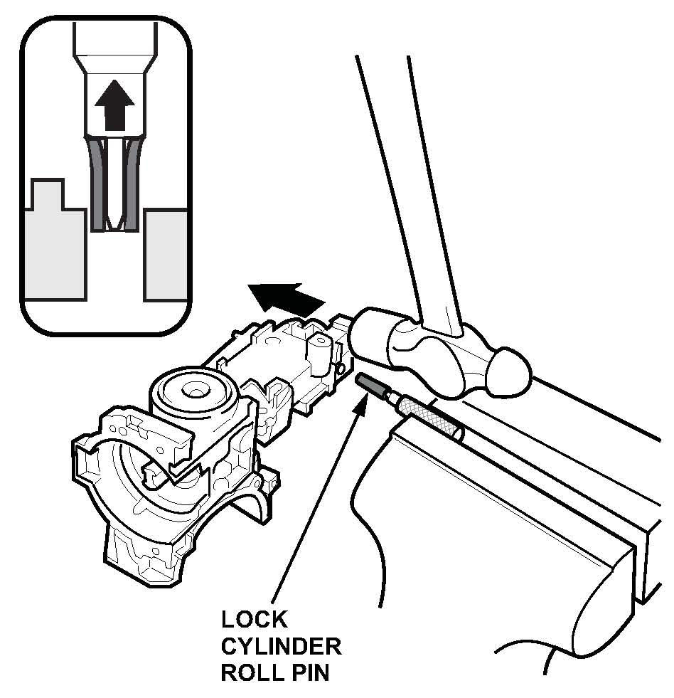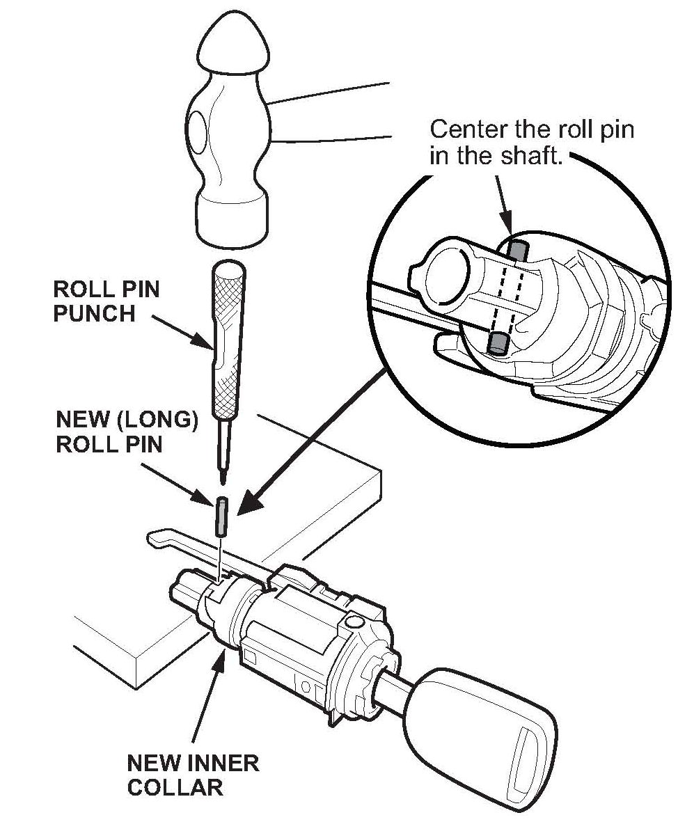 29. Install the new (short) roll pin in the hole on the lock cylinder body with a hammer and a 6 mm (or larger) flat punch. The roll pin is properly installed when the top of the roll pin is flush with the lock cylinder body.
