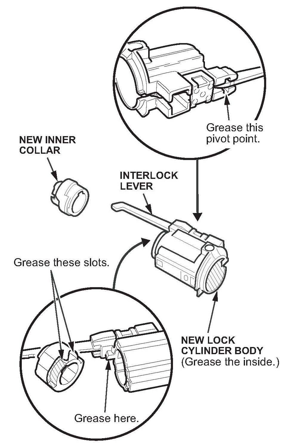 34. Apply a small amount of Permalube grease to the new interlock switch pin, and carefully install the pin on the lock cylinder body.