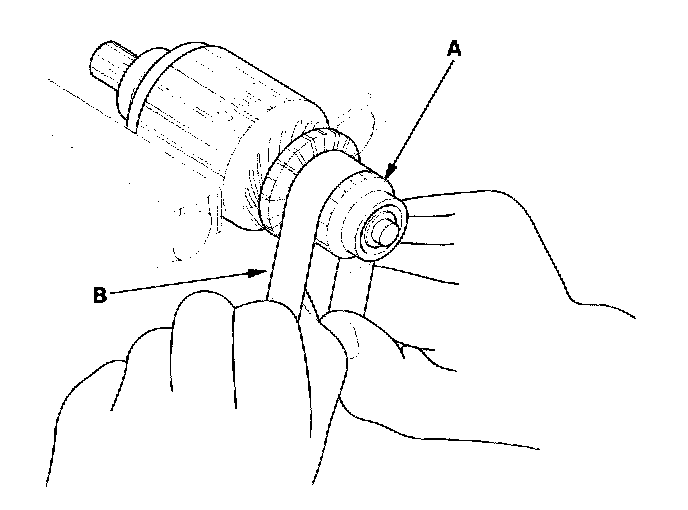 4. Check the commutator (A) surface. If the surface is dirty or burnt, resurface with emery cloth or a lathe within the given specifications, or recondition with # 500 or # 600 sandpaper (B).
