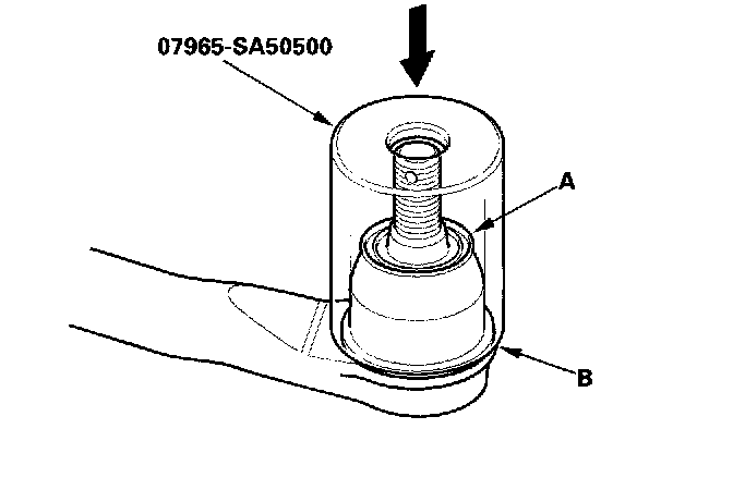 4. Install the new boot (A) using the special tool. The boot must not have a gap at the boot installation sections (B). After installing the boot, check the ball pin tapered section for grease contamination, and wipe it if necessary.