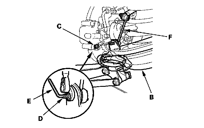 3. Remove the flange nut (C) while holding the joint pin (D) with a hex wrench (E), and disconnect the stabilizer link (F) from lower arm B.