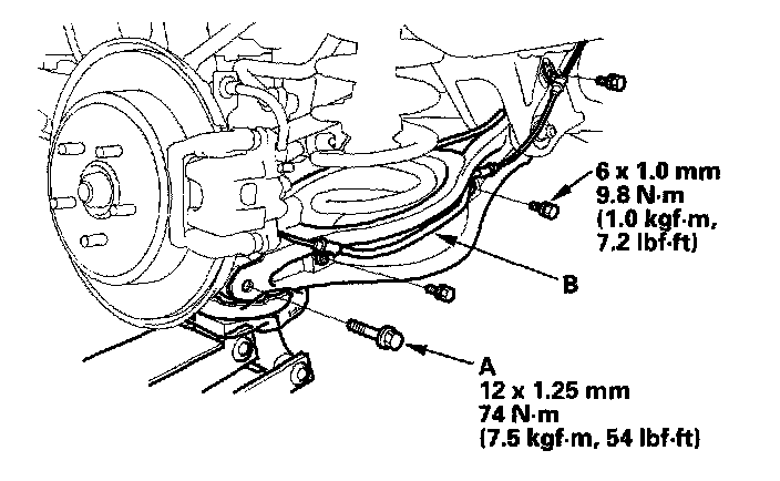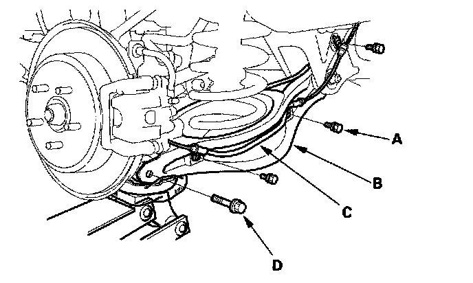 4. Remove the three flange bolts (A) and the wheel sensor harness (C) from lower arm B. Do not disconnect the wheel sensor connector.