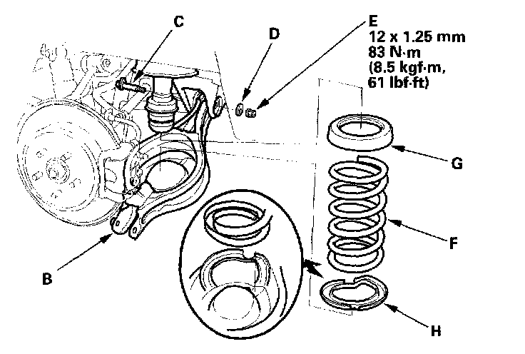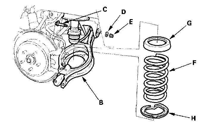 2. Install the spring (F), and upper spring seat (G). Align the bottom of the spring and the lower spring seat (H) with lower arm B as shown.
