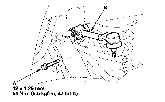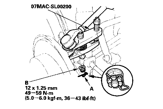 5. Remove the upper arm bolt (A). Remove the upper arm (B) from the vehicle.