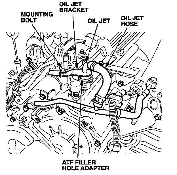 2. Remove the mounting bolt from the oil jet bracket, and remove the oil jet from the ATF filler hole. Discard the oil jet O-ring.
