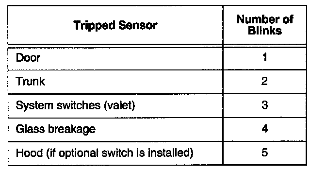 - If two sensors were tripped, such as the door and the trunk, the status LED blinks once (door), pauses, blinks twice (trunk), pauses, and then repeats the sequence.